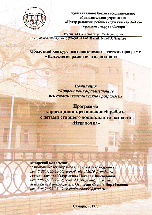 Всего к участию в конкурсе было принято 57 программ по пяти номинациям. В их числе была авторская программа коррекционно- развивающей работы с детьми старшего дошкольного возраста на основе нейропсихологического подхода «Игралочка», которая была разработана специалистами нашего ДОУ: педагогом-психологом Абрамовой О.А., учителем-логопедом Кострыгиной Н.В. и музыкальным руководителем Оганесян С.Н. Данная программа была оценена жюри конкурса наивысшим количеством баллов и стала Победителем регионального конкурса. Эта победа – очень значимое событие для нашего дошкольного учреждения. Авторский коллектив специалистов отмечен Дипломом Министерства образования и науки Самарской области. Авторские материалы по итогам участия в конкурсе опубликованы в сборнике программ победителей и лауреатов областного конкурса психолого-педагогических программ 2019 года «Психология развития и адаптации».