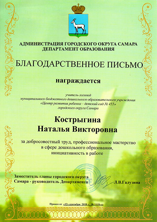- «Современные коррекционно-развивающие технологии в работе учитедя-логопеда» Центр развития образования г.о. Самара, 36 часов, декабрь 2016 – март 2017;